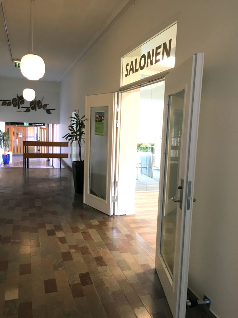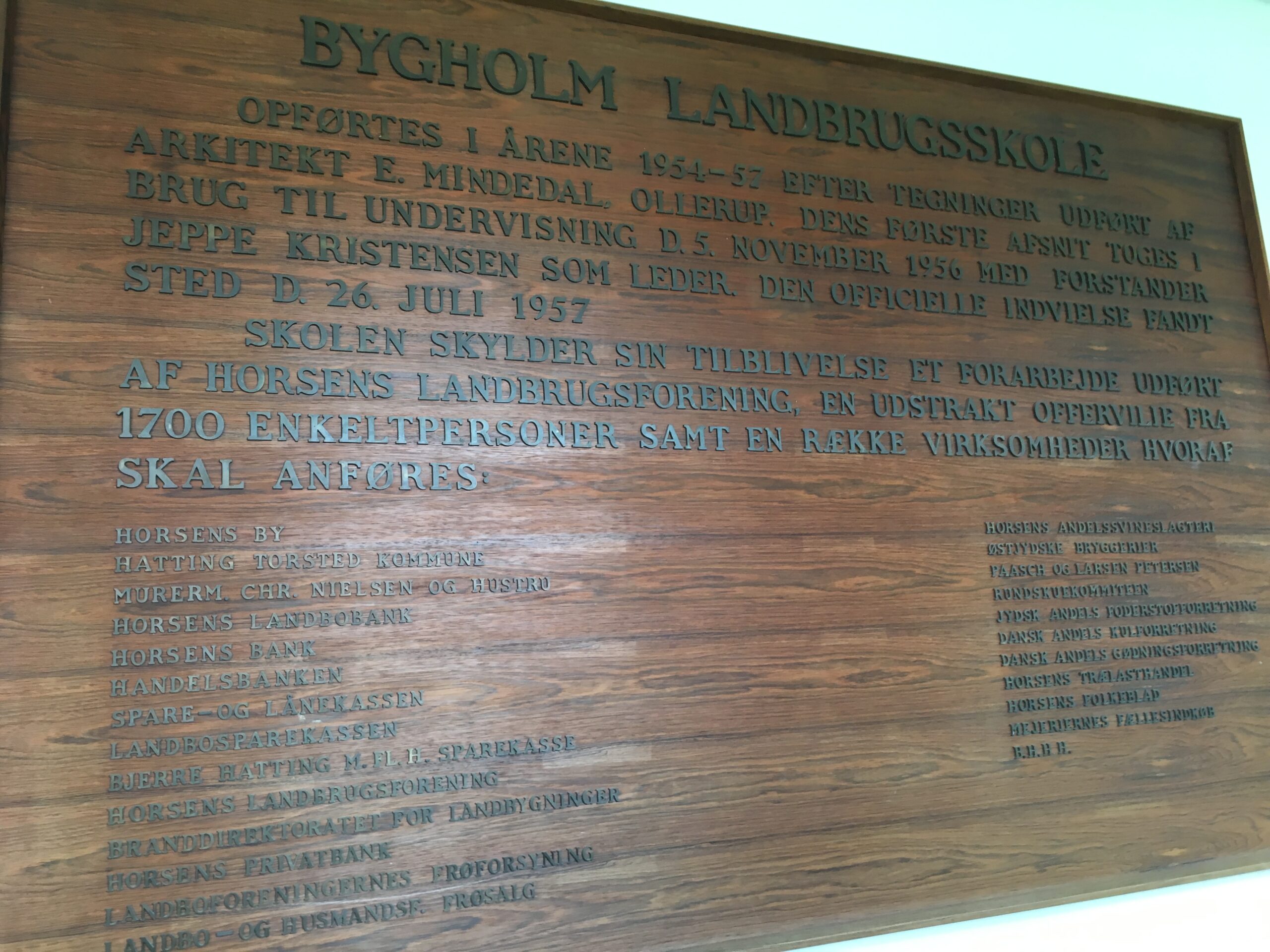 Der er masser af patina på landbrugsskolen – altså lige omkring de nye lokaler – i materialer, møbler, udsmykning og desuden gamle bøger og undervisningsmaterialer. Man finder bla de smukkeste klinker i varme nuancer i det tilstødende gangforløb.