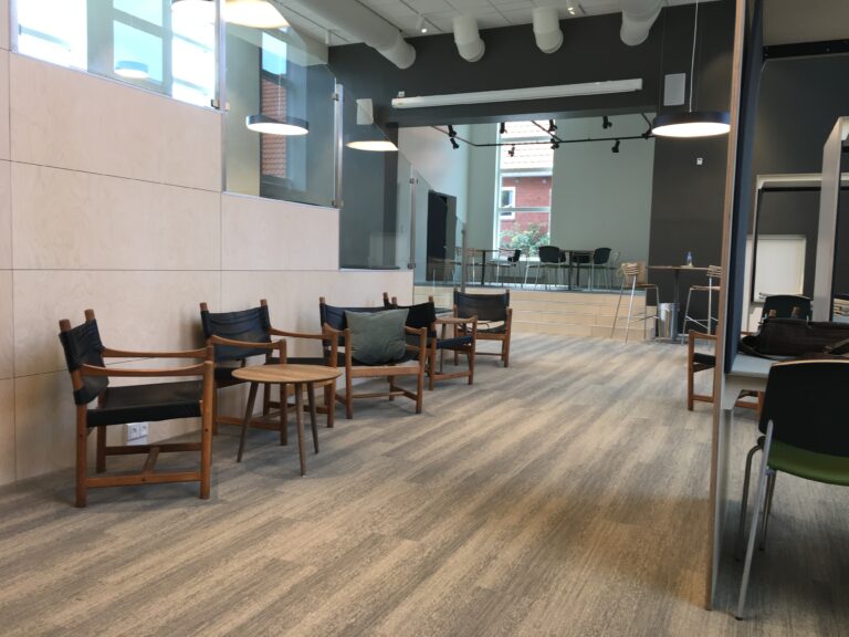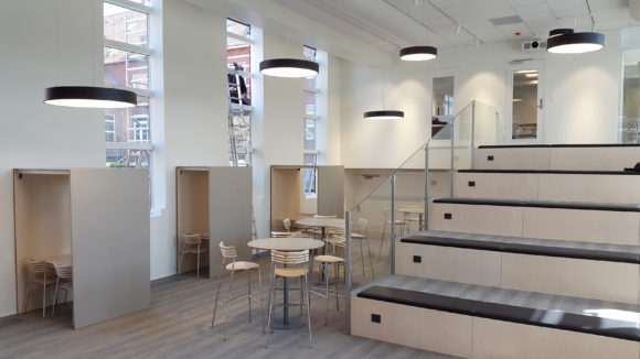 En gennemgribende ombygning af den gamle gymnastiksal på Bygholm Landbrugsskole betød at elever og lærere kunne tage nyt lyst auditorie, mødelokaler og cafémiljø i brug. Med ombygningen fulgte desuden helt nye møbler til de nye lokaler.