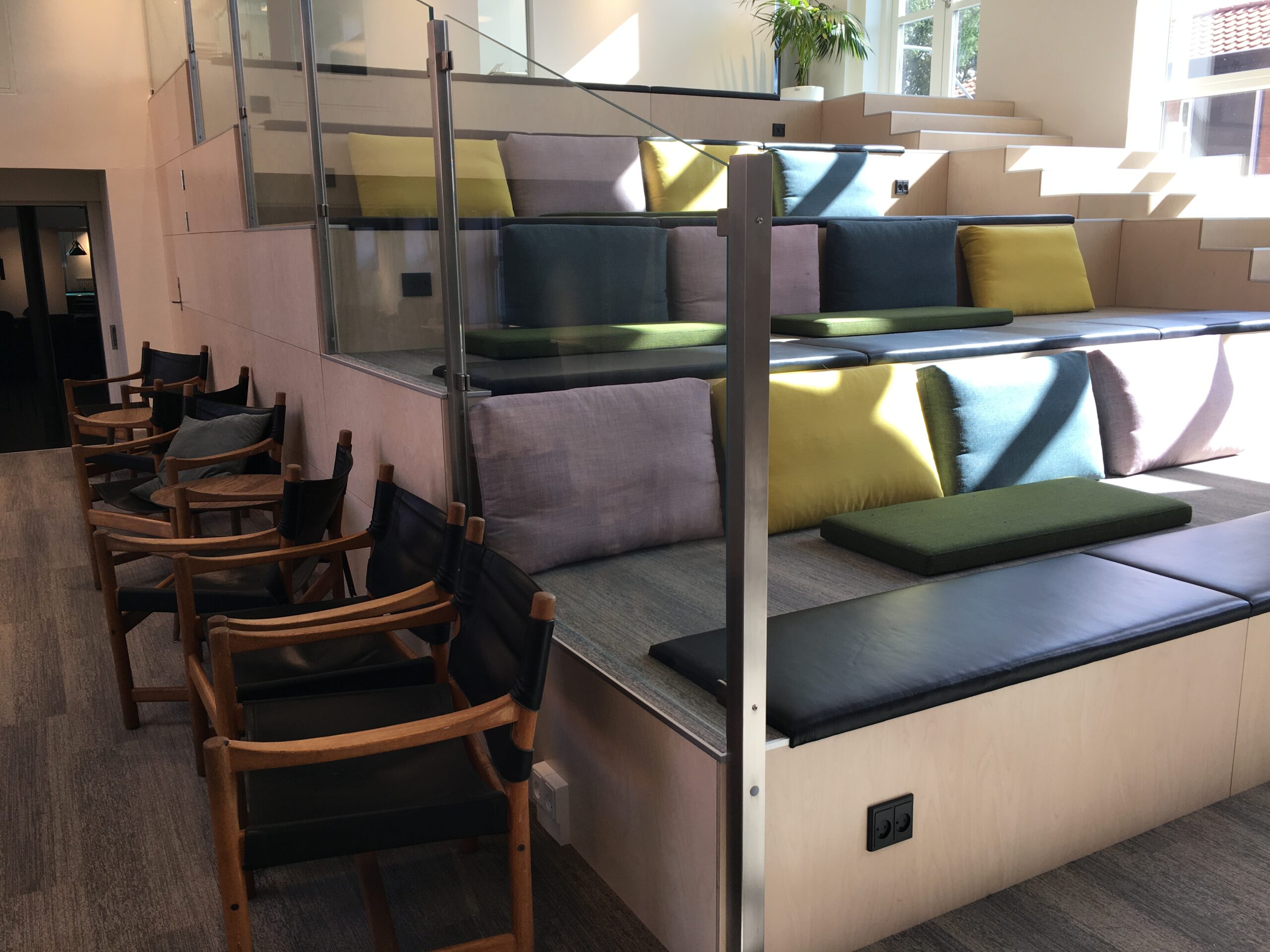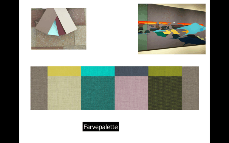 Jeg præsenterede et ideoplæg indeholdende en farvepalette, som tog hensyn til skolens oprindelige materialer og patina. En fotograf blev sendt i “marken” og udsmykning og hynder til “trappen” blev bestilt i glade farver.