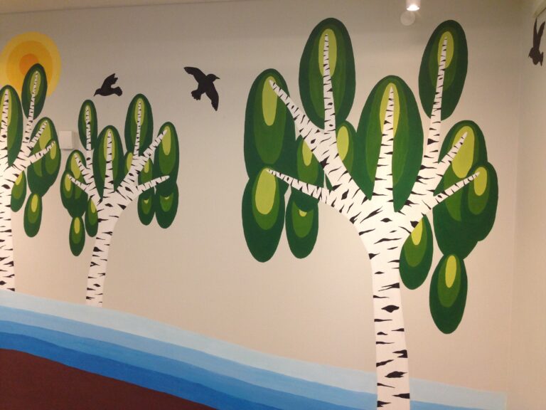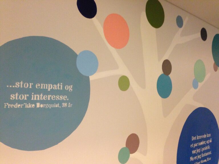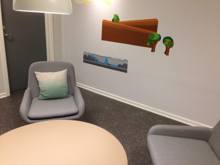 Det har været en interessant proces, hvor jeg har bidraget med oplæg og sparring omkring farver og motiver til de designstuderende, som herefter har udsmykket samtalerum og gangareal.