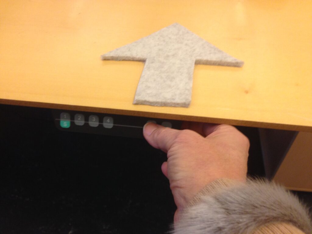 Et af de nudges, de har haft fokus på, er filtpilen på skrivebordet, som blev udviklet i forbindelse med pilotprojektet i House of Innovation. Formålet er at “skubbe” til, at vi husker at hæve bordet (læs mere).