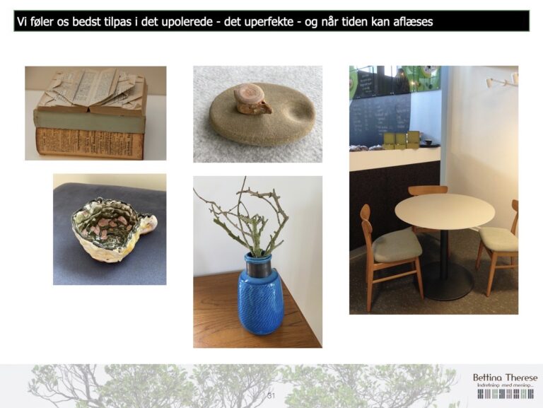 Jeg benytter mig altid af den japanske æstetik wabi-sabi – oplevelsen af skønheden i det uperfekte, når jeg indretter. Derfor er beboerne også omgivet af loppefund og møbler med sjæl – i rolig forening med bla IKEA. Vi føler os bedst tilpas i det upolerede og det er især vigtigt, når vi taler sårbar indretning.