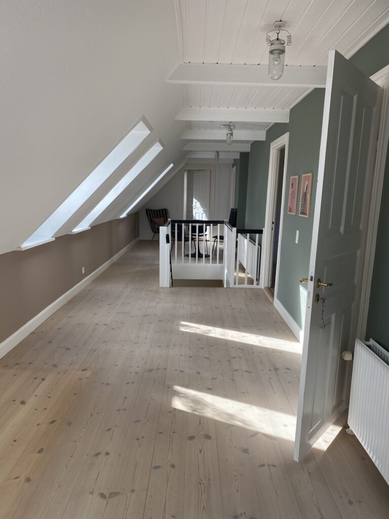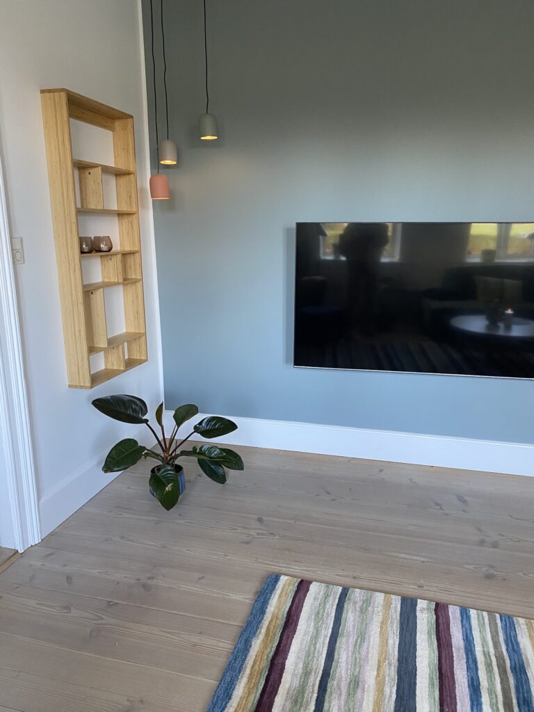 Straks når man åbner fordøren til stuehuset, bliver man mødt af hyggelig og hjemlig indretning og farver, som tager imod.