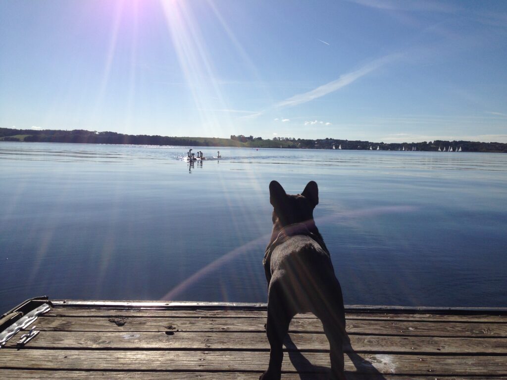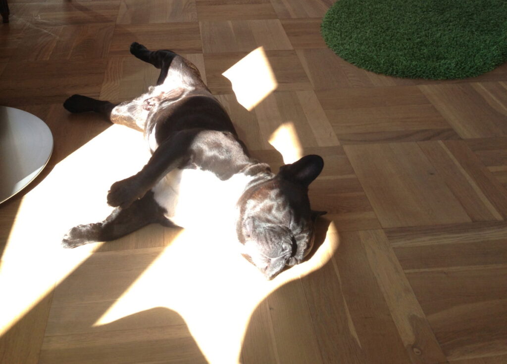 Hvis han pludselig er væk under skrivebordet, er det næsten 100% sikkert – solen skinner og han har lagt sig ind i stuen – lige der, hvor solens stråler rammer gulvet – og her ligger han og suger vitaminer til sig. Og det minder mig om at tage en pause og lappe i mig af solens vitaminer.