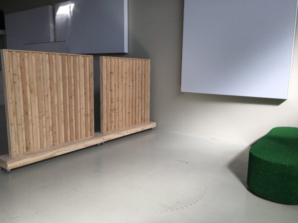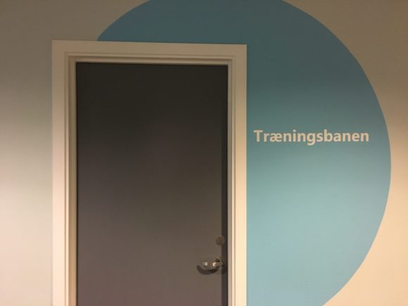 Men før selve indretningen af træningsbanen er det vigtigt at sørge for de nødvendige indgreb til at opnå et rum, hvor brugerne føler sig trygge og hvor akustikken er go. Ellers kan det blive en dårlig oplevelse at øve samtaler og spille rollespil derude. Løsningen var nye store lydplader og en varm vægfarve.